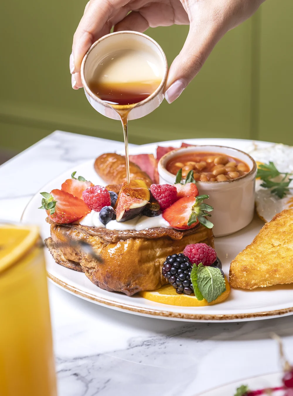 French toast, seasonal fruit, mascarpone and ricotta cream, 2 rich yolk fried eggs, turkey bacon, beef sausage baked beans & hash brown