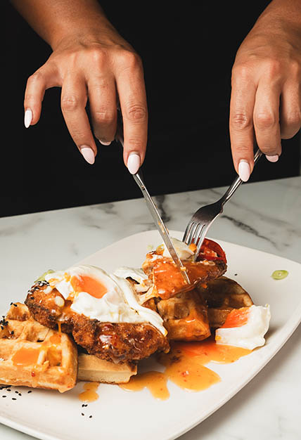 Half homemade waffle creamy spinach fried chicken tenderlion 2 poached rich yolk eggs & butter hallondaise sauce topped with criapy turkey bacon